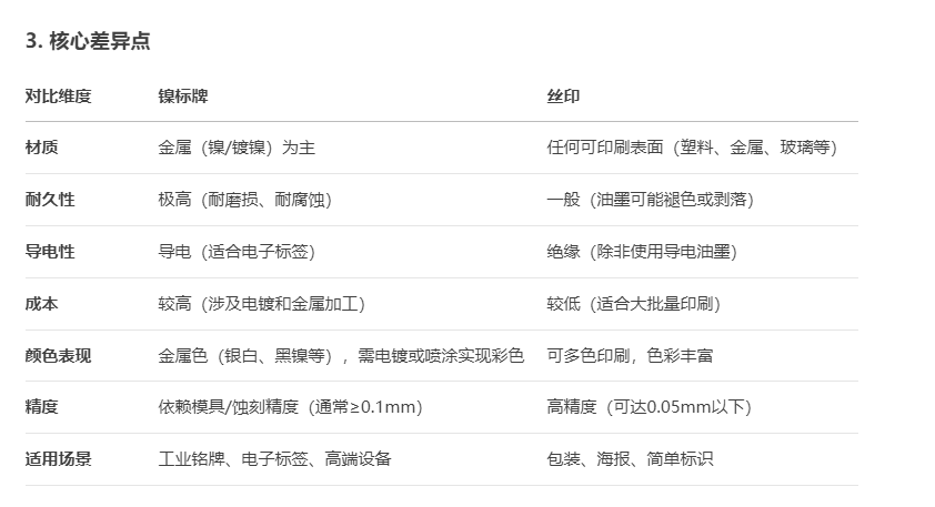 鎳標(biāo)牌和絲?。ńz網(wǎng)印刷)是兩種完全不同的工藝,用途、制作方式和最終效果都有顯著區(qū)別。以下是它們的核心差異對(duì)比: