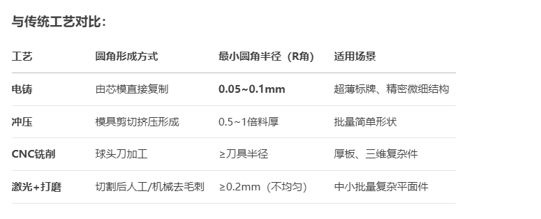 電鑄金屬標(biāo)牌的圓角形成原理與沖壓、CNC等減材工藝完全不同。電鑄是增材制造工藝,其圓角是通過芯模(模具)的設(shè)計與制作直接決定的,并在電沉積過程中完美復(fù)制出來。以下是詳細解析: