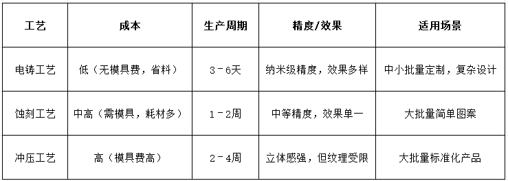 表面粗糙度可達(dá)納米級,圖形邊緣光滑無毛刺,支持復(fù)雜效果(立體凸字、鏡面、拉絲紋、十字紋等)。
