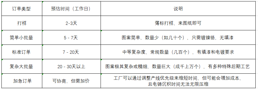 假設是一個中等復雜度的鎳鉻材質標牌訂單,其標準流程和時間估算如下: