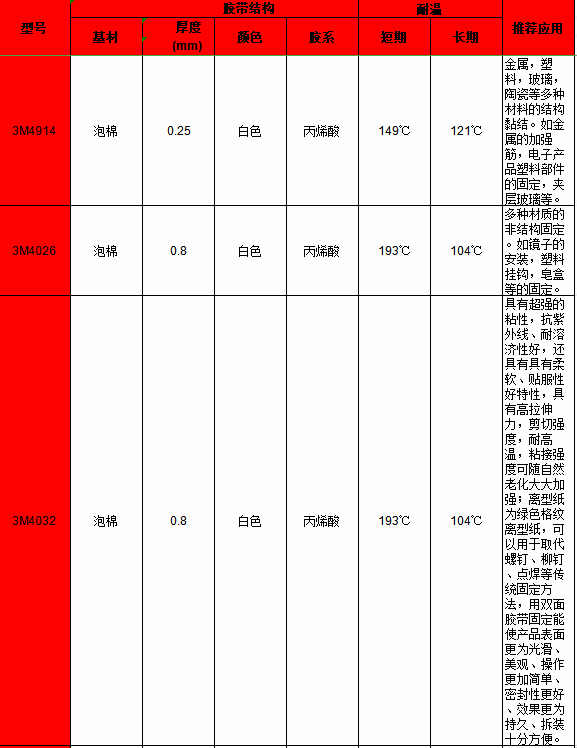 (以上是3M 4914、3M 4026、3M 4032相關(guān)型號(hào)特點(diǎn)說明)