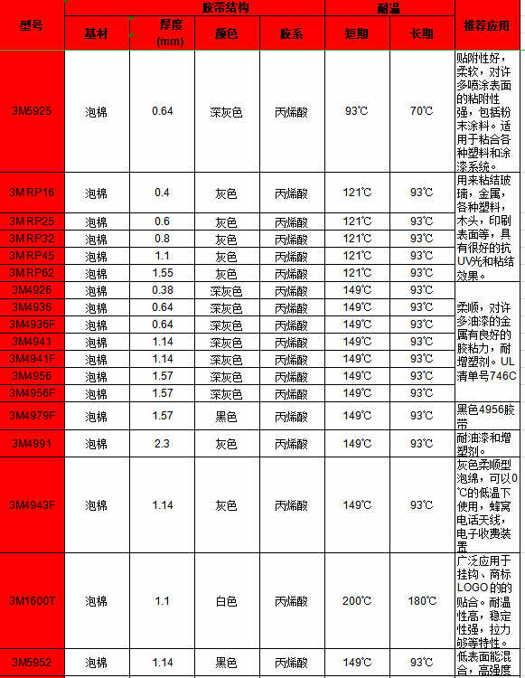 (上圖介紹的3M膠帶分別型號(hào)為:3M5925、3MRP16、3MRP25、3MRP32、3MRP45、3MRP62、3M4926、3M4936、3M4936F、3M4941、3M4941F、3M4956、3M4956F、3M4979F、3M4991、3M4943F、3M1600T、3M5952。)